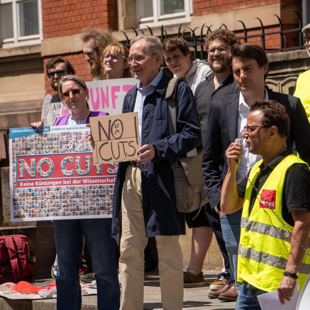Die angedrohten Budgetkürzungen an Hessens Hochschulen gefährden zukunftsweisende Forschung, die Ausbildung künftiger Fachkräfte und sind ein bildungspolitischer Offenbarungseid der CDU-SPD Landesregierung. Deshalb waren wir heute mit @verdihessen, der @gewhessen und der @lakhessen in #Kassel und #Darmstadt auf der Straße.