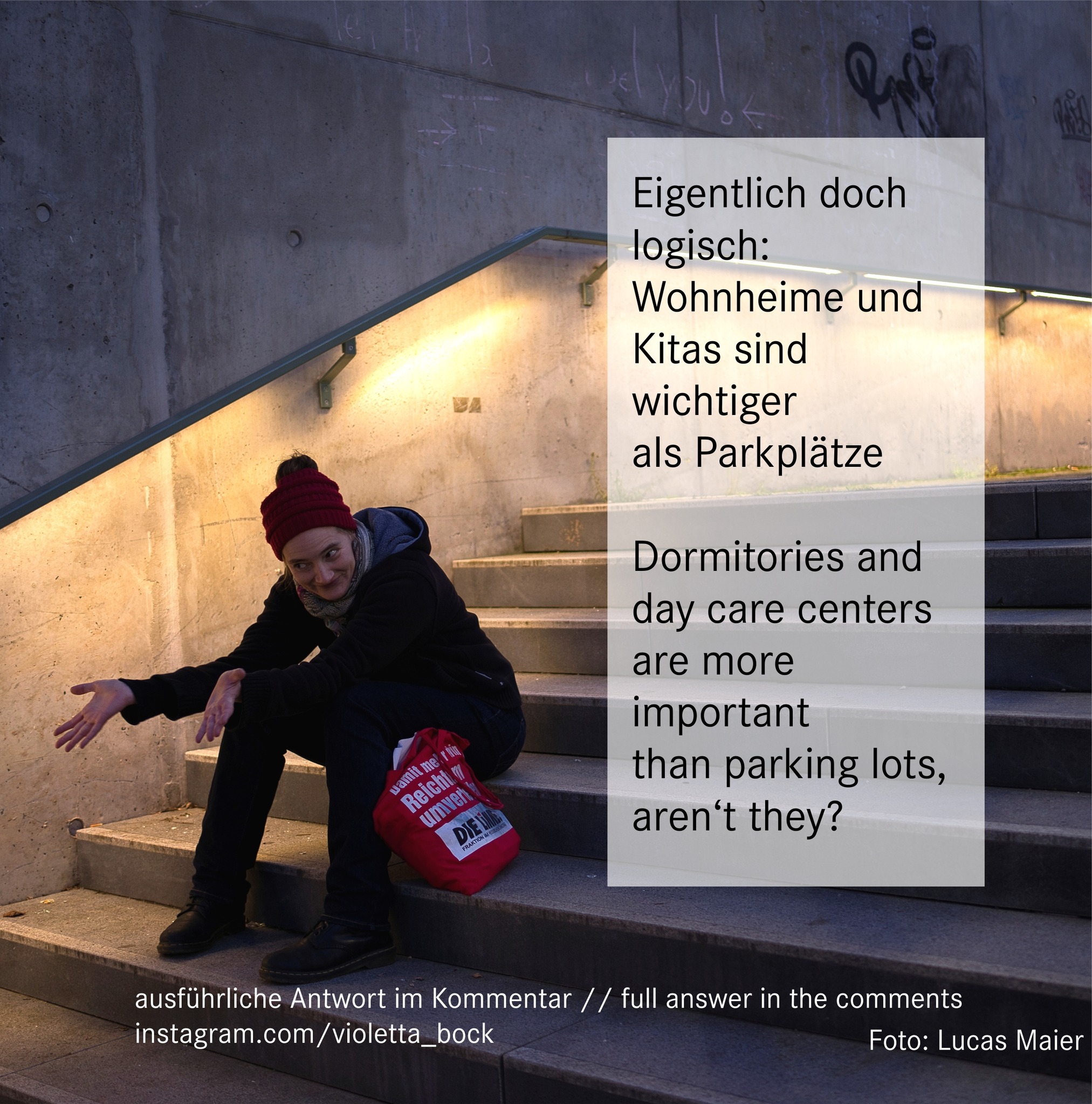 Es ist jederzeit möglich, auf Autostellplätze weitgehend zu verzichten, wenn der politische Wille da ist. Als Oberbürgermeisterin würde ich darauf pochen, dass keine unnötigen Parkplätze geplant werden. Als linke Stadtverordnete kämpfe ich seit Jahren für eine sozial-ökologische Verkehrswende. und die funktioniert nur, wenn der Autoverkehr deutlich reduziert wird. Eine Anpassung der Stellplatzsatzung ist überfällig. Weniger Parkplätze, wo immer es geht, und mehr Platz für Bäume, Fußgänger*innen, Radfahrende und Öffis – das ist mein Ziel.